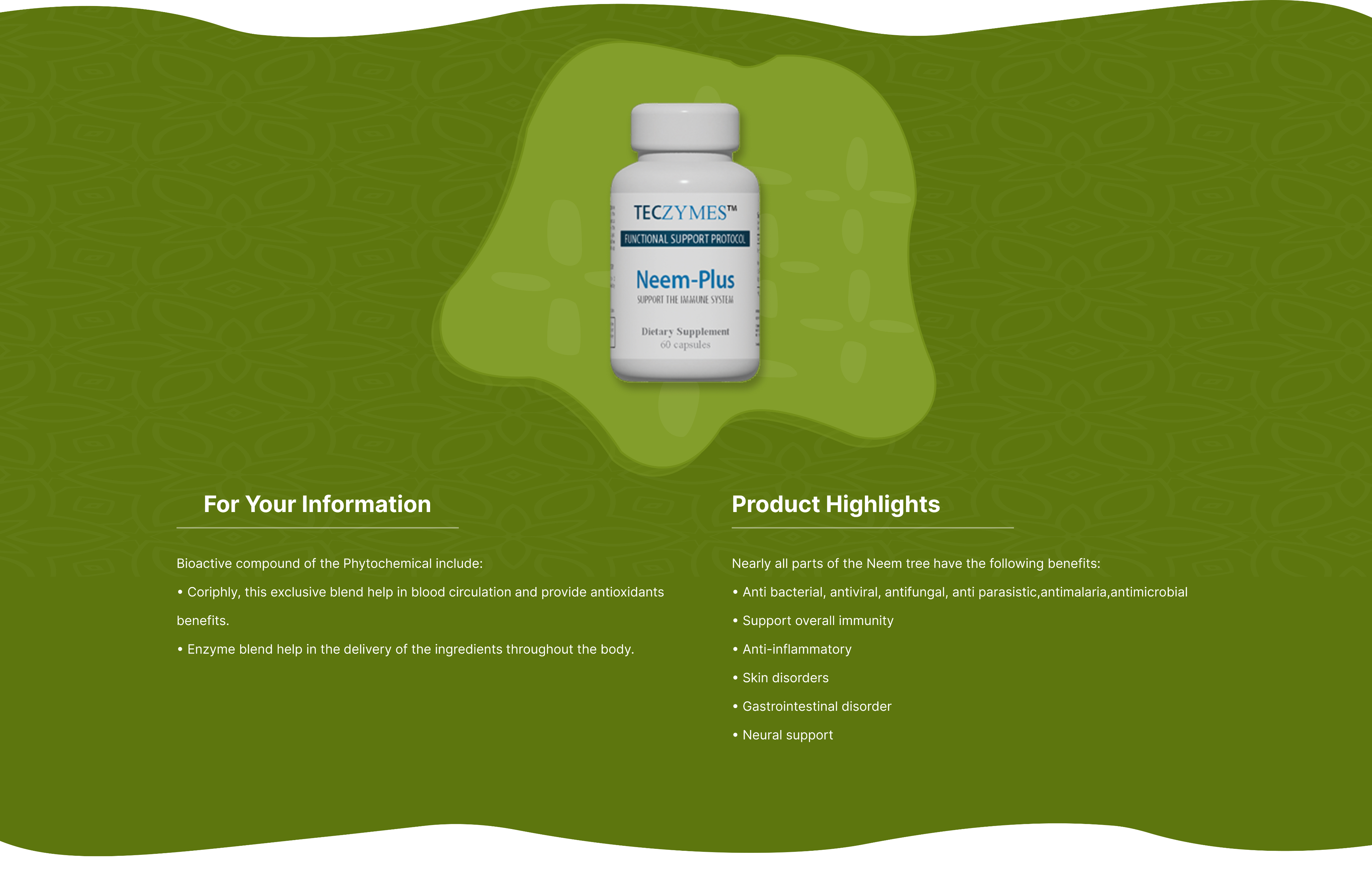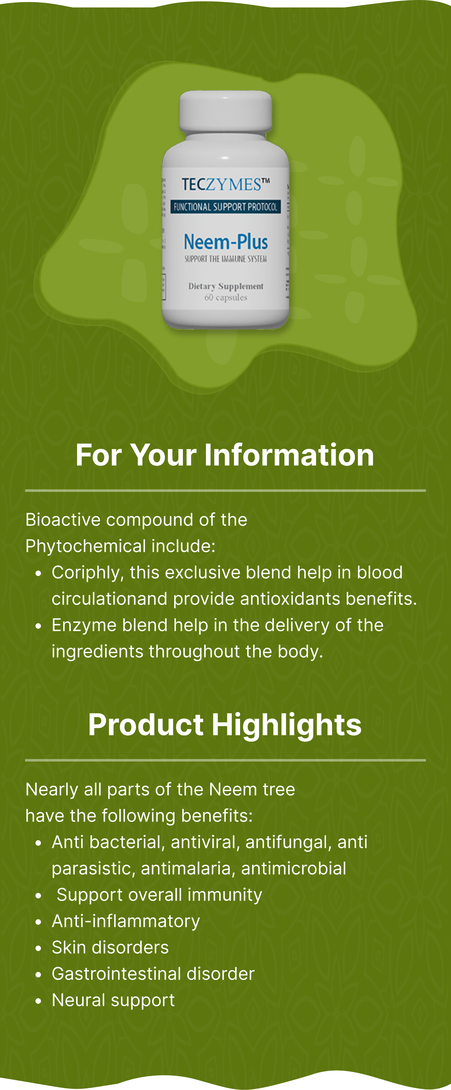TECZymes™ Neem-Plus is a unique, scientifically formulation based on the proven health benefits and the biological activities of the main ingredient, Neem tree, a valued medicinal plant. Enhanced with the immune modulation trait of beta glucan isolate from mushroom and the blend of enzyme, this formulation help the body to recover from both internal and external inflammation and other health challenges It bring the body to balance and wellness.