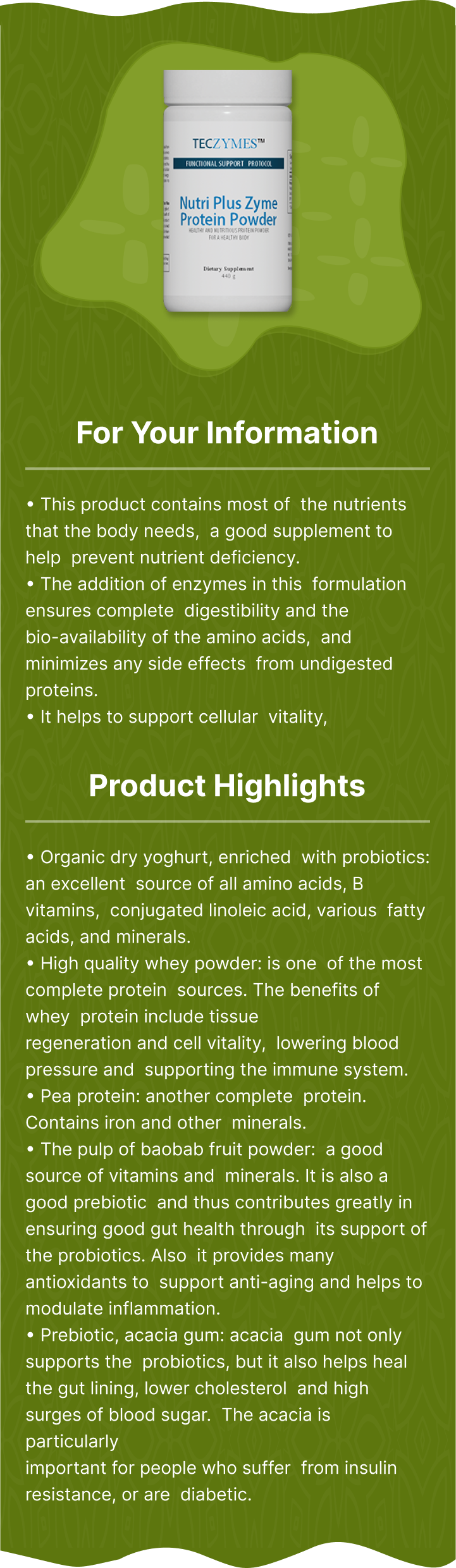 TECZymes™ Nutri Plus Zyme Protein Powder is for NIMS (nutrient intake management system). It is is made from a proprietary blend of highly nutritious proteins with complete amino acids, as well as other nutrients, and probiotics. (Proteins are the building blocks of life. Everything in the body is made of proteins or made by proteins. The basic structure of protein is a chain of amino acids. Deficiency in proteins, especially essential amino acids, creates a favourable ground for many