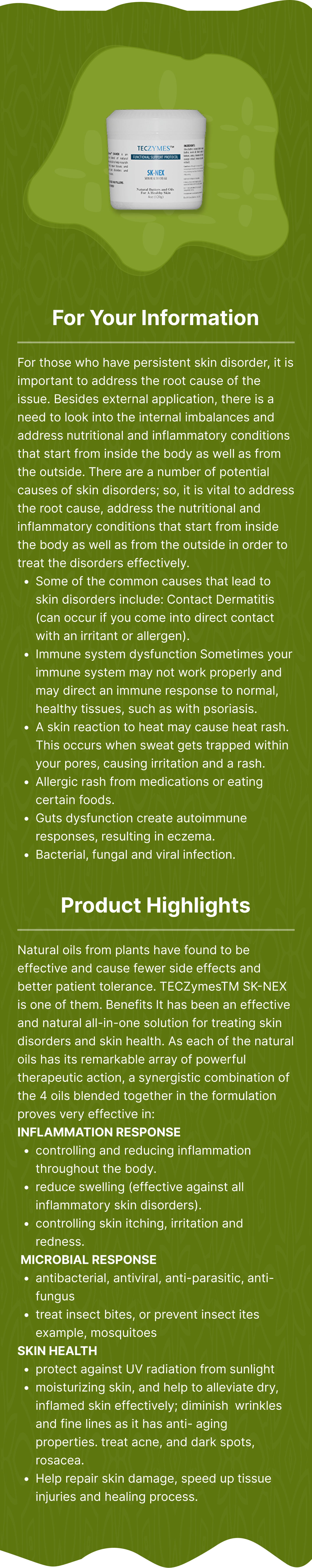 TECZymes SK-NEX is a complex formulation blend of natural oils (black cumin oil, coconut oil, neem oil and arnica oil). In addition to these natural oils as the main ingredients, TECZymes SK-NEX contains a synergistic combination of other powerful ingredients including shea butters, amino acid and enzymes, to help support skin health and alleviate and reduce various inflammatory skin disorders.